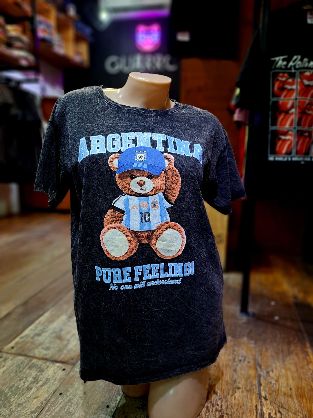La tela con la que confeccionamos estas prendas a sido sometida a un proceso de lavado y tratamiento (Stone Washed) lo que le da un aspecto suave al tacto y desgastado a la vista. Se logra así una remera aspecto vintage cómoda y funcional.
