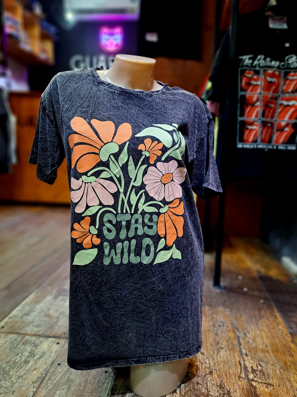 La tela con la que confeccionamos estas prendas a sido sometida a un proceso de lavado y tratamiento (Stone Washed) lo que le da un aspecto suave al tacto y desgastado a la vista. Se logra así una remera aspecto vintage cómoda y funcional.