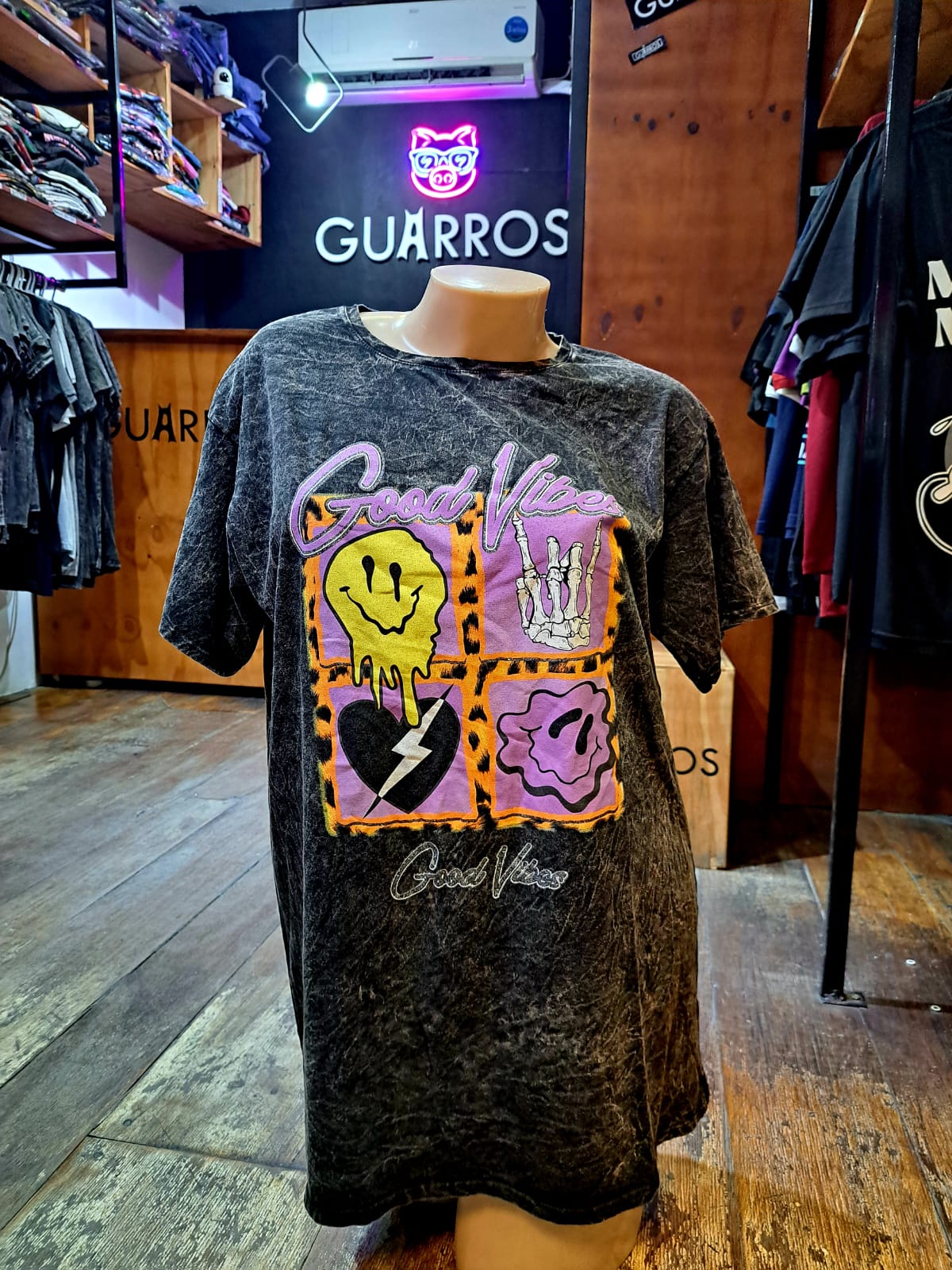 La tela con la que confeccionamos estas prendas a sido sometida a un proceso de lavado y tratamiento (Stone Washed) lo que le da un aspecto suave al tacto y desgastado a la vista. se logra así una remera aspecto vintage cómoda y funcional.
