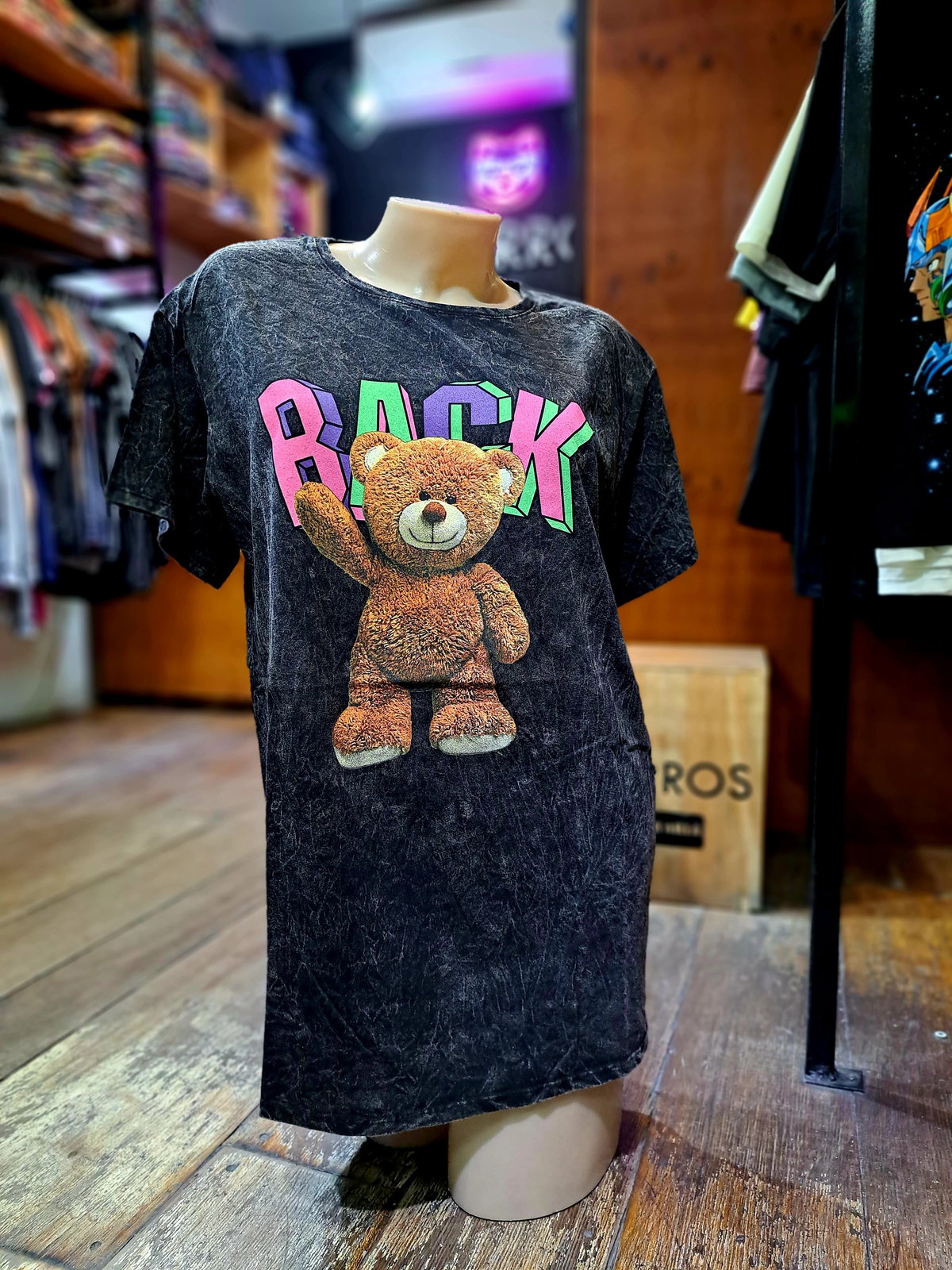 La tela con la que confeccionamos estas prendas a sido sometida a un proceso de lavado y tratamiento (Stone Washed) lo que le da un aspecto suave al tacto y desgastado a la vista. Se logra así una remera aspecto vintage cómoda y funcional.