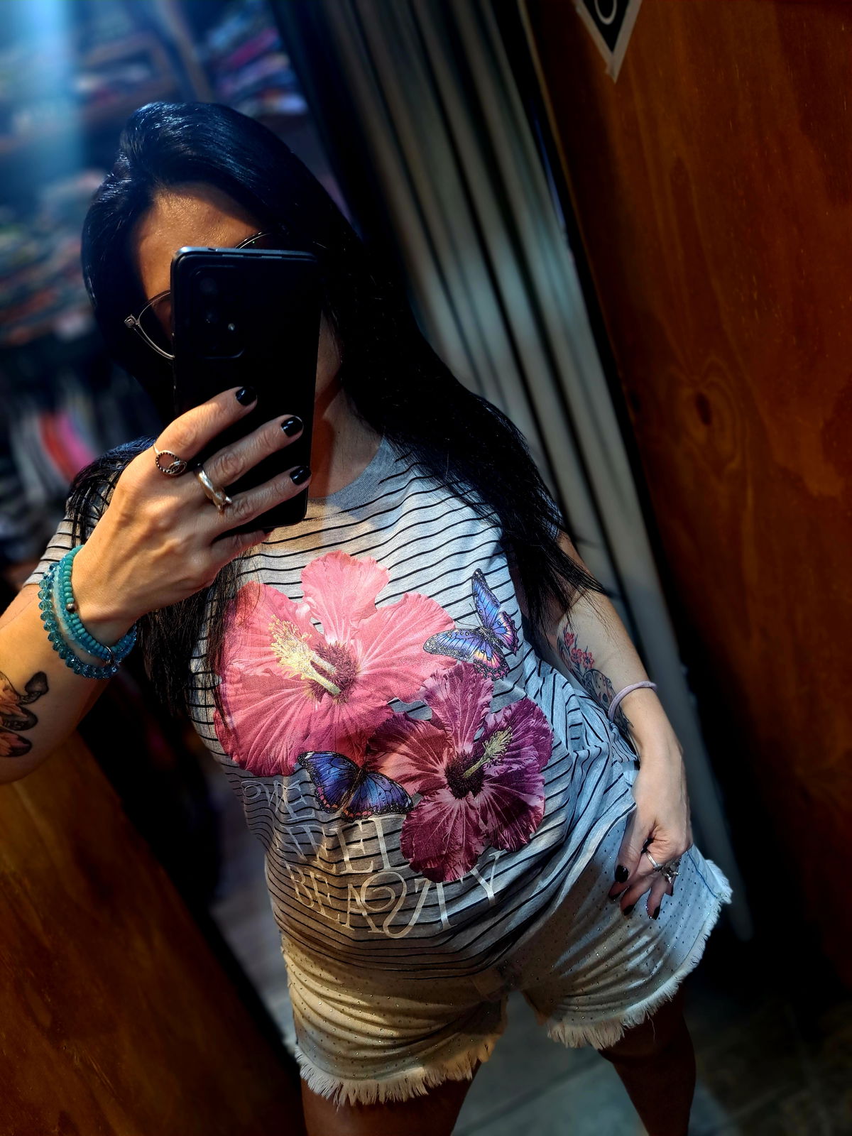 50cm Remera Rayada Gris Flores Beauty