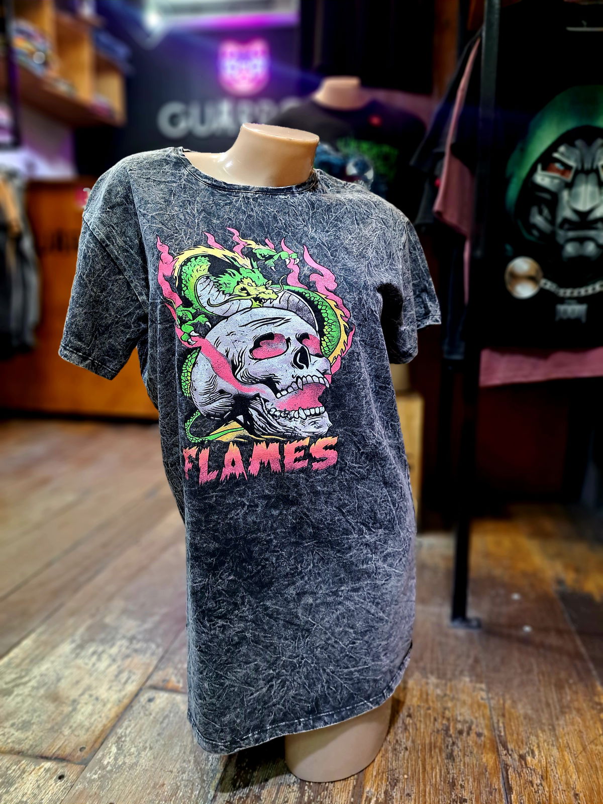 La tela con la que confeccionamos estas prendas a sido sometida a un proceso de lavado y tratamiento (Stone Washed) lo que le da un aspecto suave al tacto y desgastado a la vista. Se logra así una remera aspecto vintage cómoda y funcional.